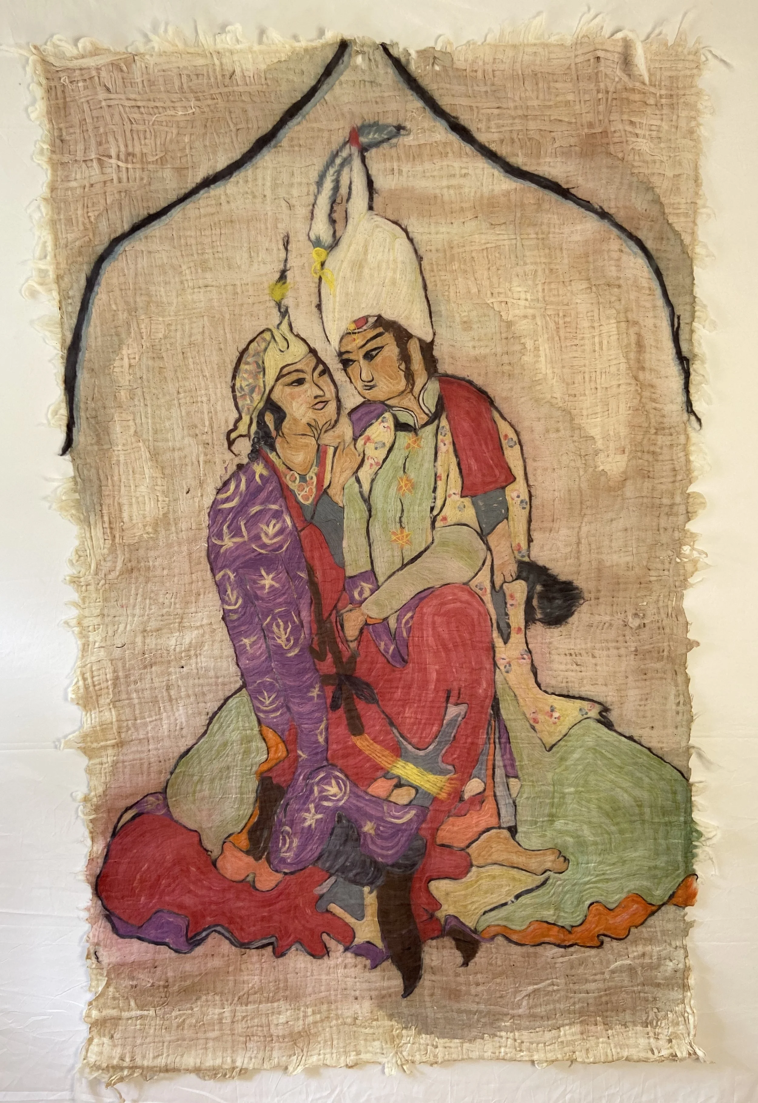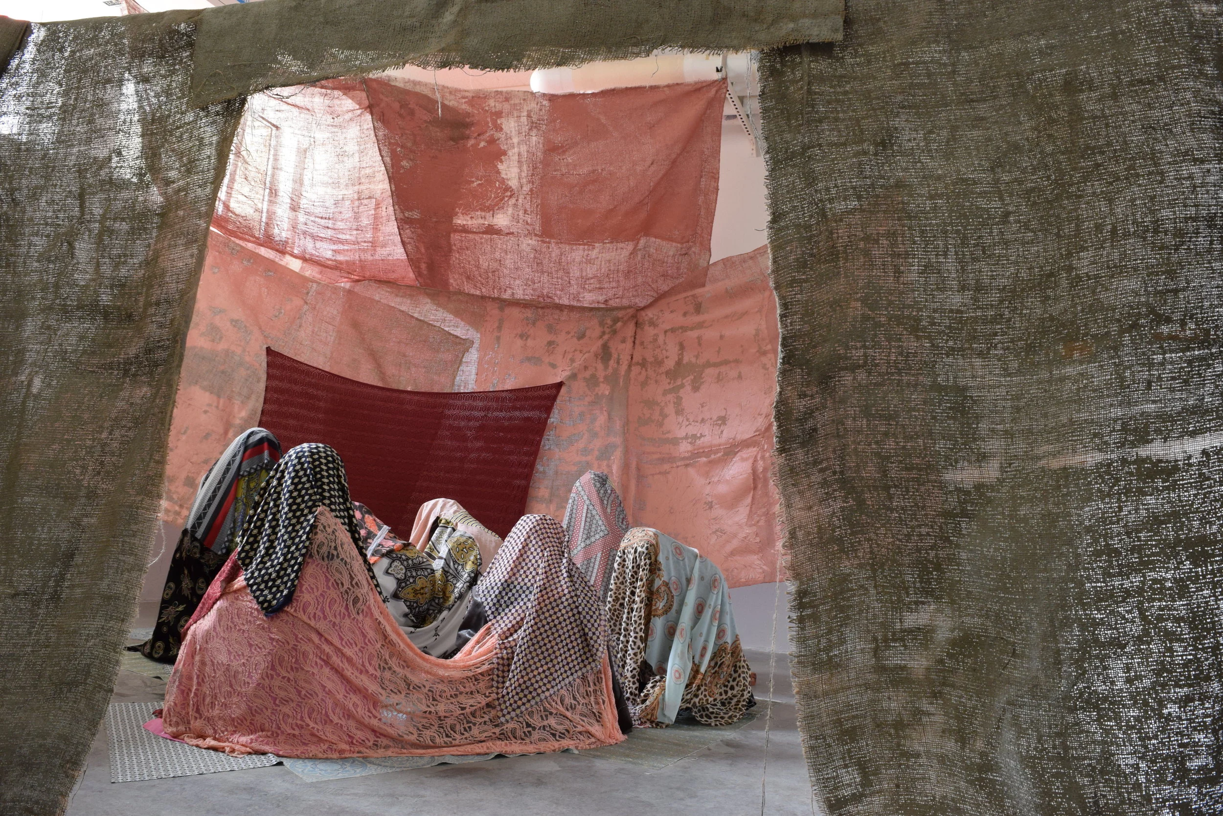 “Behind Closed Doors”, is a large scale fabric installation that explores the queer feminine in 1,001 Arabian Nights. Through re-envisioning the text’s submerged queer narratives and foregrounding them visually through large scale fabric sculptures, I visually push back on the narrative of an ahistorical queer Muslim/Arab existence while grounding our historic and contemporary presence in our native cultures. By utilizing delicate materials such as cotton fiber and natural dyes, I explore the precarious presence that the queer Muslim/Arab subject occupies in both the metaphorical East and West and how our existence troubles that imagined binary. My work in both materiality and subject is designed to insist upon presence in the face of enforced absence so that the queer Muslim/Arab subject is not forced to choose among and between mutually exclusive binaries but can have a “home” in the in-between space.
