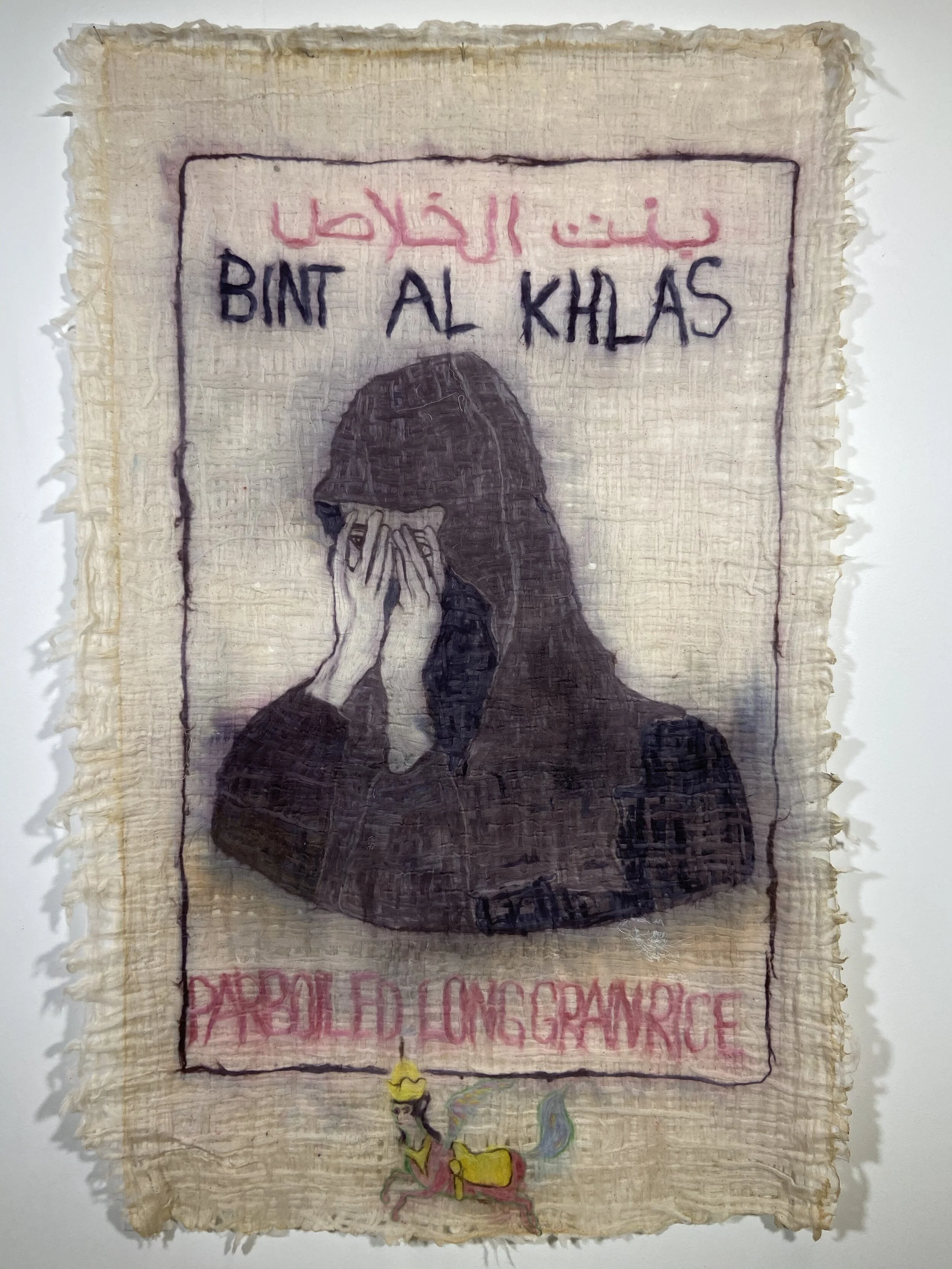 “BINT AL ARAB” Is inspired by a real rice bag from the now defunct “Bint Al Arab” brand. Acting as a hyper object, this rice bag and design is an important motif in my life, especially growing up in a small Midwestern city, largely isolated from mainstream Arab and Islamic culture. Finding any non-orientalist interpretations of my heritage and religion was a challenge. BINT AL ARAB (Daughter of Arabs/ Arab Girl) became a huge influence in my life through its simple yet provocative logo design. The original logo features a flat, 1 color block print of woman in Niqab, staring off to the left and avoiding the viewers gaze, perhaps out of disinterest, bashfulness, or because she’s simply in her own world. This image had me fixated and admiring her presence the day she surfaced in my life. Invoking a similar feeling of questioning that the Mona Lisa many on her admirers, I would gaze at Bint Al Arab and wonder, “What’s on her mind? How is she feeling?”